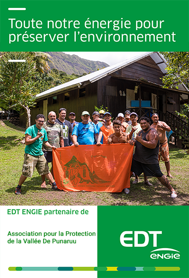 C’est le cas pour la vallée de la Punaruu, avec l'association des porteurs d'oranges, l’Amicale Te Arii Nui, et jusqu’à l’association Tamarii pointe des pêcheurs, qui agissent toutes pour assurer le futur de cette vallée jusqu’au lagon, grâce au soutien d’EDT ENGIE. La protection de la faune locale constitue un autre versant de notre engagement éco-responsable, via les parrainages de la Société d’Ornithologie de Polynésie MANU qui sauvegarde les oiseaux du fenua, et de Te Mana O Te Moana, qui lutte pour la faune marine, notamment les tortues. EDT ENGIE s’investit pour l’environnement.