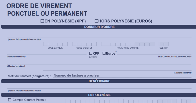 Pour activer votre prélèvement automatique, téléchargez et remplissez le formulaire d’autorisation de prélèvement suivant, sans oublier d’y joindre votre RIB (domicilié uniquement en Polynésie française).